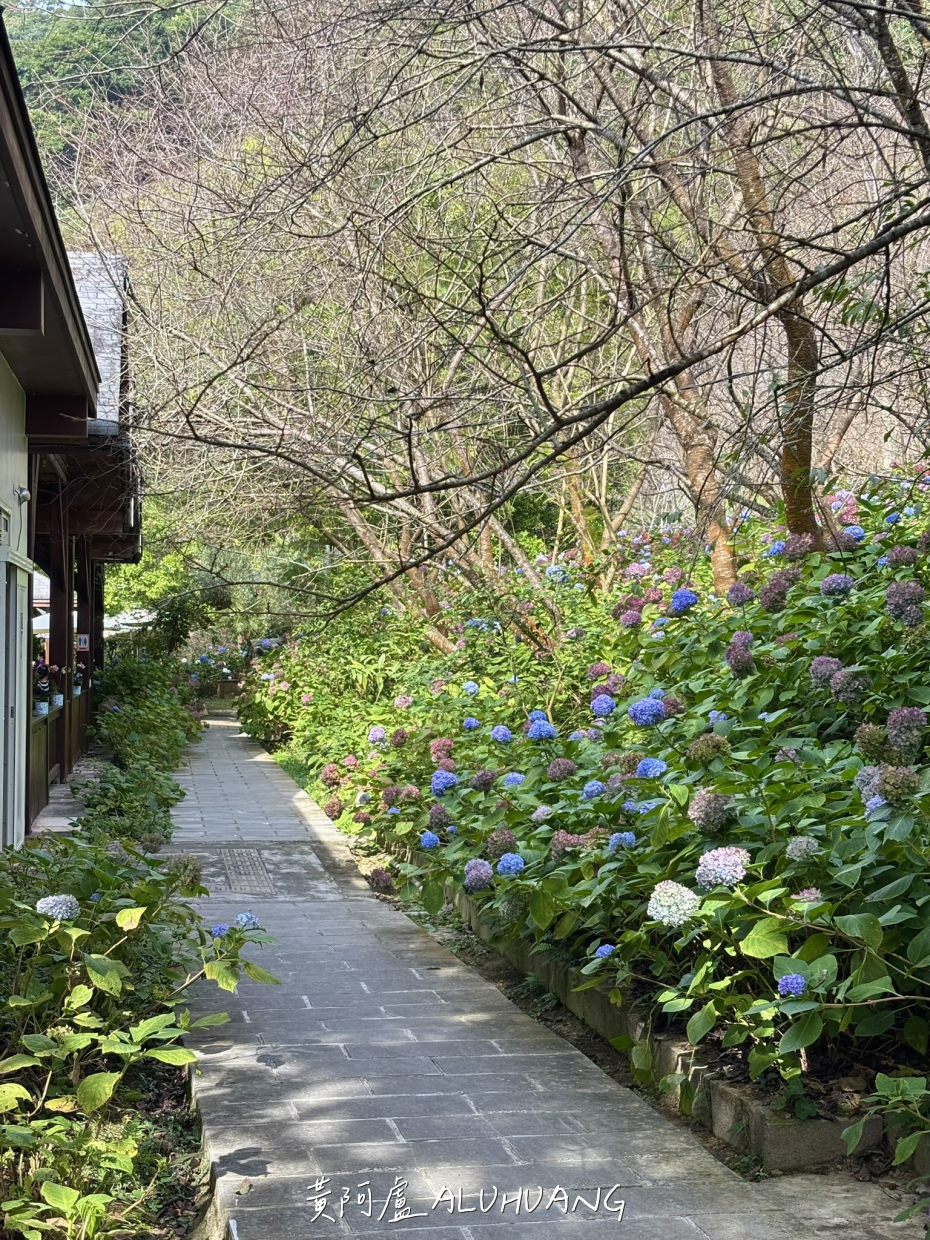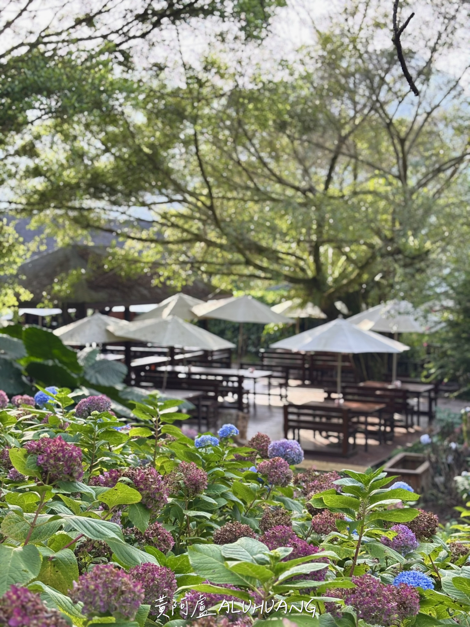 在門口停完車,買完票後,順著水泥地走上去,餐廳跟第一間廁所在左手邊,我來的時候有看到繡球花,繡球花是前兩年種的,現在已經長高了。